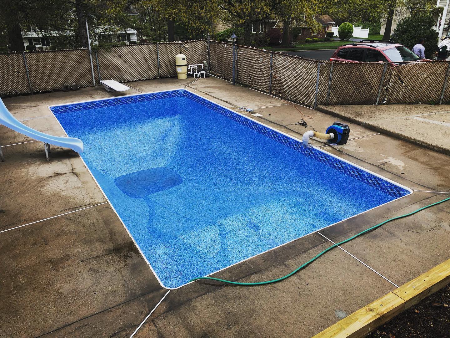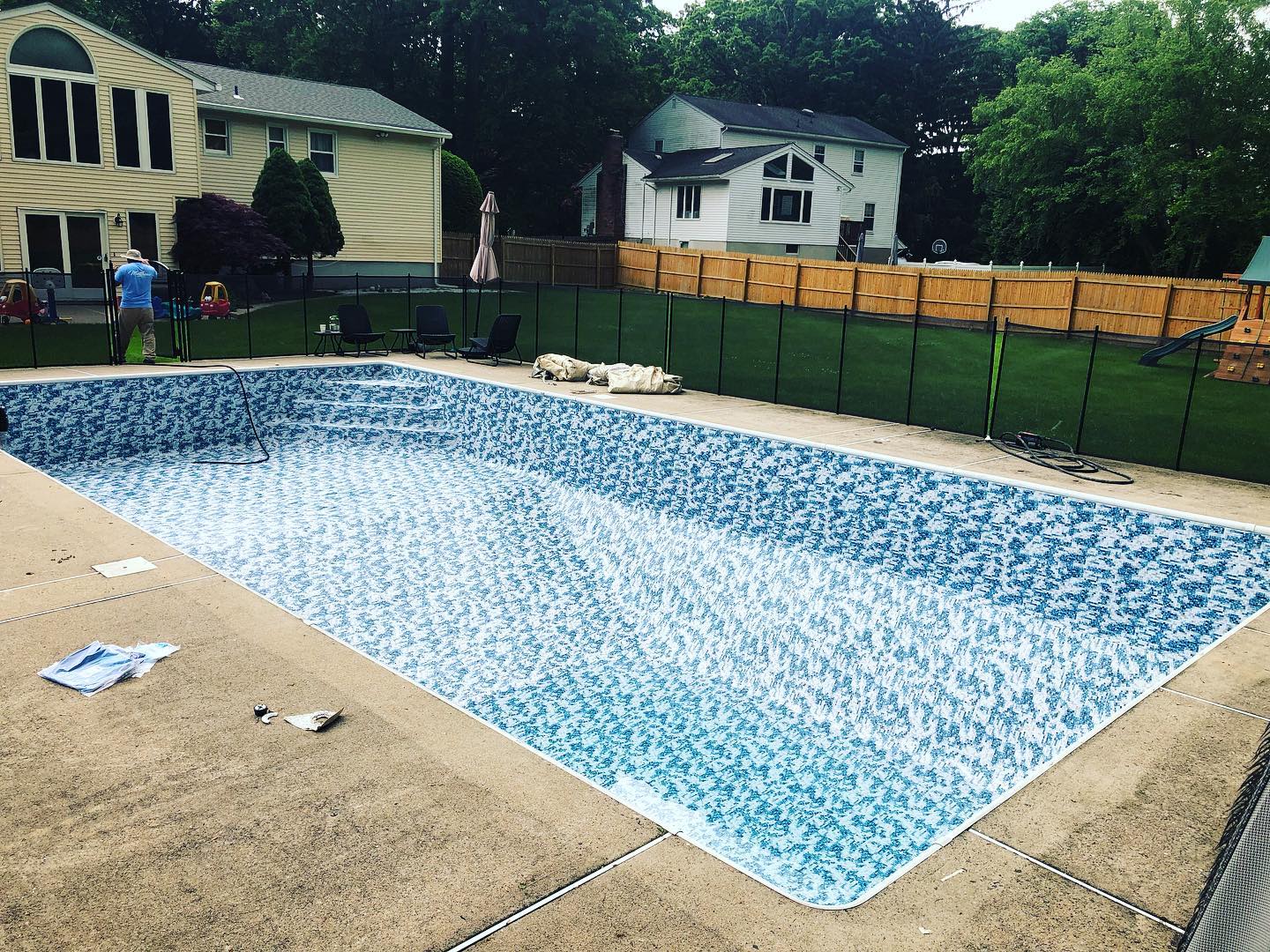 Our liner replacement service is typically comprised of 3 service visits; measuring day, liner installation day and cut day. Cutting the vinyl to expose skimmers, return jets and special features is done after the swimming pool is filled half way to allow the material to fully stretch into position.